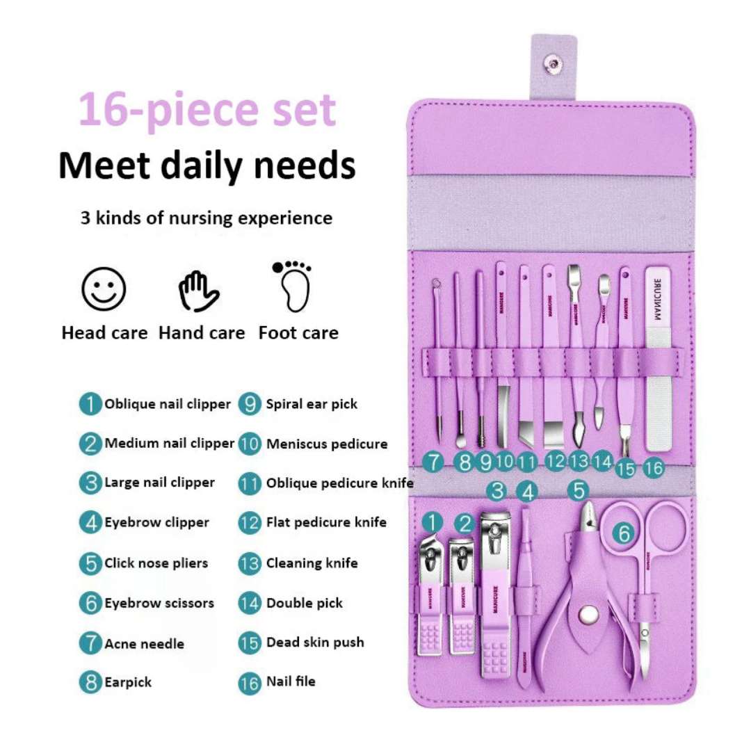 This 16-piece manicure and pedicure set is a complete grooming solution for head, hand, and foot care. Housed in a compact lavender case, each tool is precision-crafted for specific tasks—from nail clipping and cuticle trimming to eyebrow shaping and skin cleaning. The set includes oblique, medium, and large nail clippers, eyebrow scissors, acne needle, ear picks, pedicure knives, and more. Ideal for personal use or gifting, this travel-friendly kit ensures hygiene and style wherever you go. Durable stainless steel tools are securely organized in a snap-closure case for easy access and long-term use.