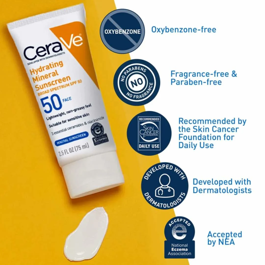 Perfect for normal to sensitive skin types, CeraVe Hydrating Mineral Sunscreen SPF 50 provides reliable sun protection while keeping your skin hydrated, comfortable, and protected throughout the day.