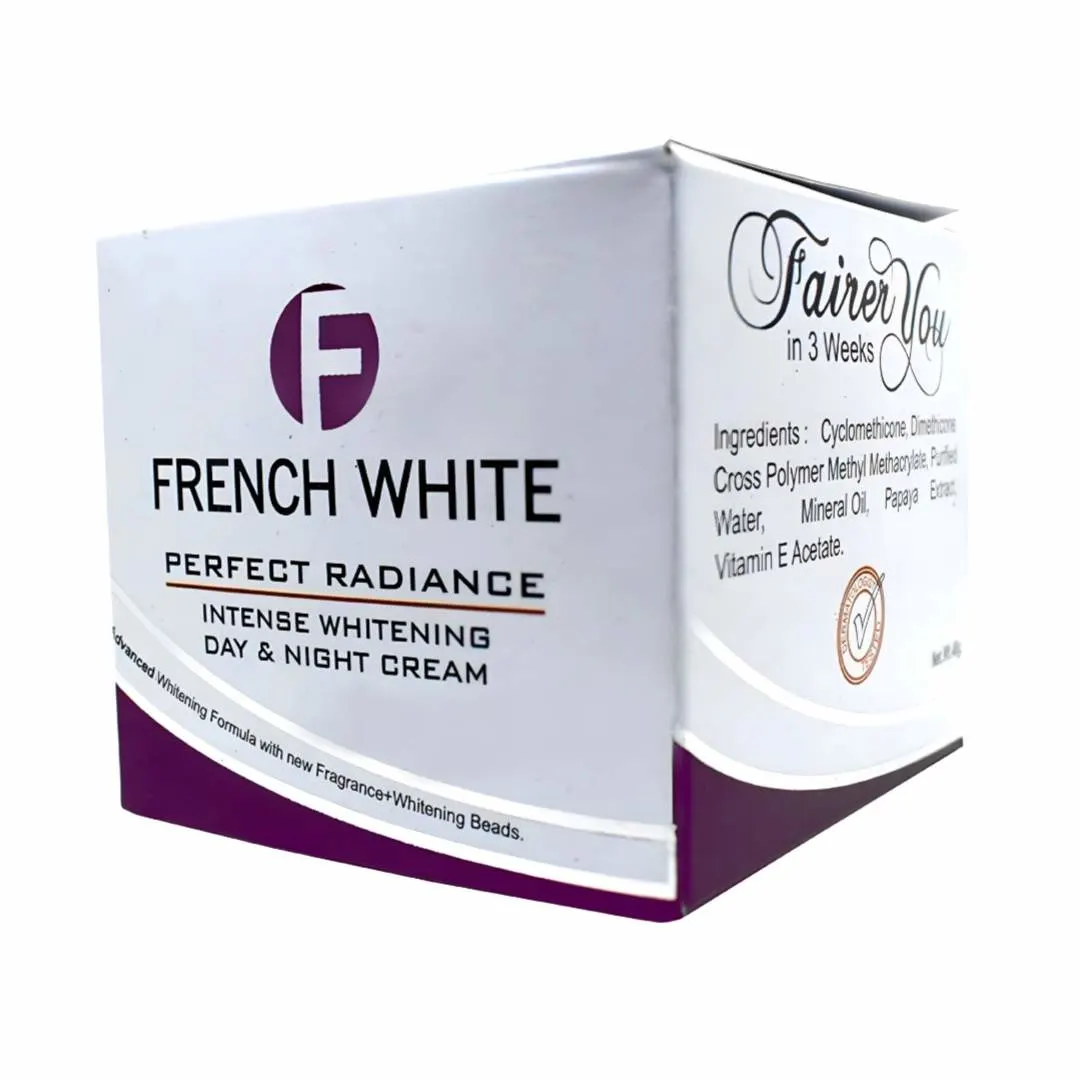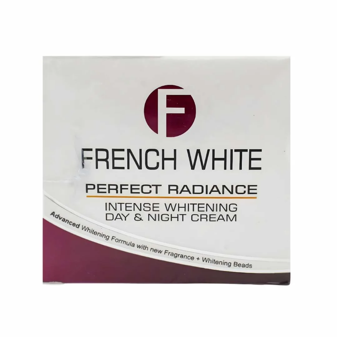 FRENCH WHITE Perfect Radiance Intense Whitening Day & Night Cream is a dual-action skincare solution designed to enhance skin brightness and clarity. Formulated with an advanced whitening blend, it combines Papaya Extract, Vitamin E Acetate, and Whitening Beads to help reduce dullness and promote a visibly fairer complexion.