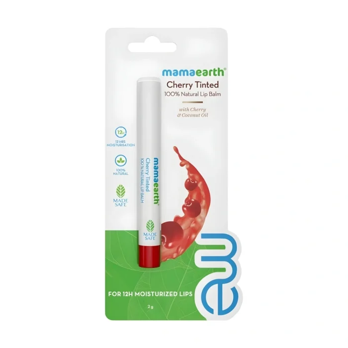 Mamaearth Cherry Tinted 100% Natural Lip Balm is enriched with the goodness of Cherry and Coconut Oil to give your lips long-lasting hydration and a soft natural tint. Crafted with safe and natural ingredients, this lip balm provides up to 12 hours of moisturization, leaving your lips smooth, nourished, and healthy. It is dermatologically tested, Made Safe Certified, and free from harmful chemicals. Perfect for daily use, this natural lip balm protects lips from dryness while adding a subtle cherry tint, making it ideal for soft, moisturized, and beautiful lips every day.