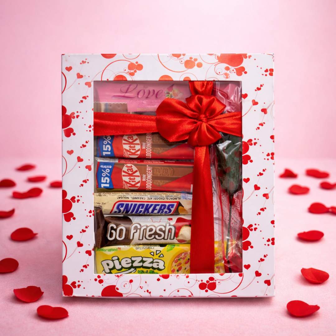 Celebrate love with this elegant Valentine’s Day chocolate gift box, thoughtfully designed to create a memorable romantic surprise. This premium gift set comes in a beautifully printed box with a transparent lid, allowing the chocolates and gifts inside to be clearly showcased. Finished with a stylish presentation, this gift is perfect for Valentine’s Day, anniversaries, birthdays, or any special romantic occasion.