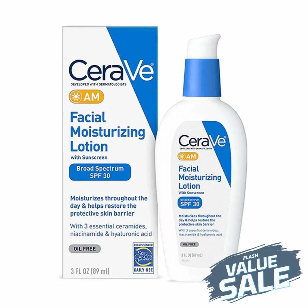 CeraVe AM Facial Moisturizing Lotion (SPF 30) provides broad spectrum sun protection while delivering lightweight, oil-free hydration throughout the day. Formulated with 3 essential ceramides, niacinamide, and hyaluronic acid, it helps restore the skin’s protective barrier while shielding it from harmful UVA and UVB rays.