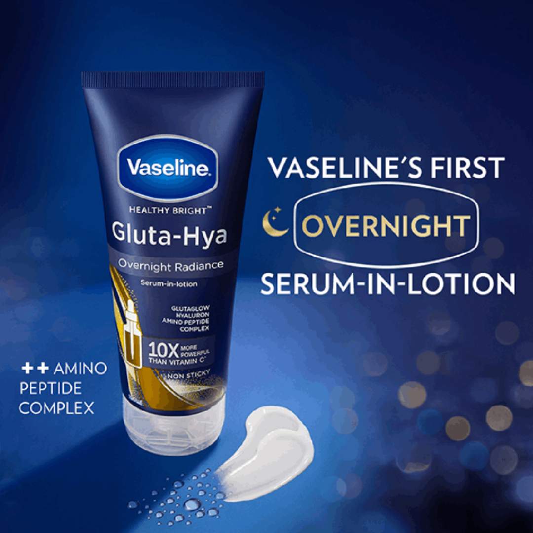 Vaseline Healthy Bright Gluta-Hya Overnight Radiance Repair Serum-in-Lotion is specially designed to work overnight to restore skin radiance, improve brightness, and deeply hydrate the skin. This advanced serum-in-lotion combines the power of GlutaGlow, Hyaluron, and Amino Peptide Complex to deliver visible results while you sleep.